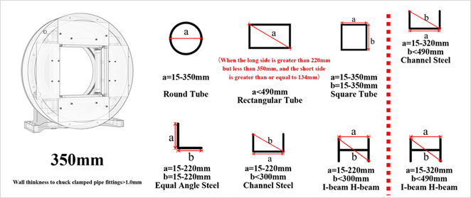 | Минимальная ширина резки, мм | 15 – 350 mm (диаметр круглой трубы) до 225 mm (наруж. диаметр прямоугольной трубы) |