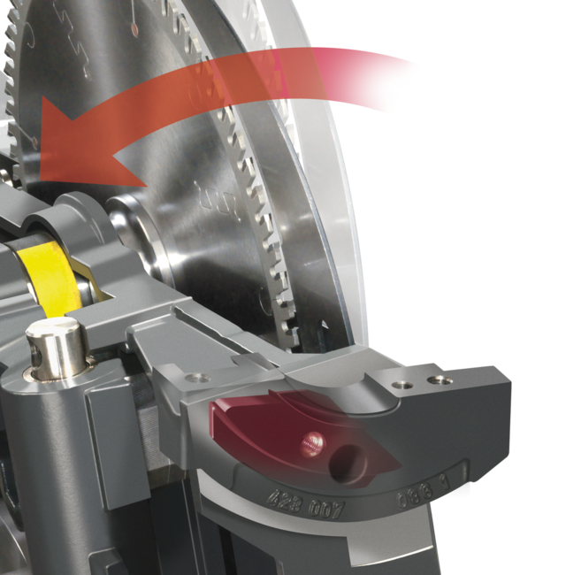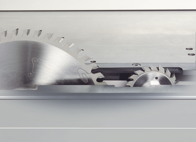 Усовершенствованный пильный агрегат с запатентованной системой направляющих с поворотными сегментами "Easy-Glide" позволяет использовать основной пильный диск диаметром 250 мм с пильными полотнами подрезного агрегата диаметром 315 и 120 мм.