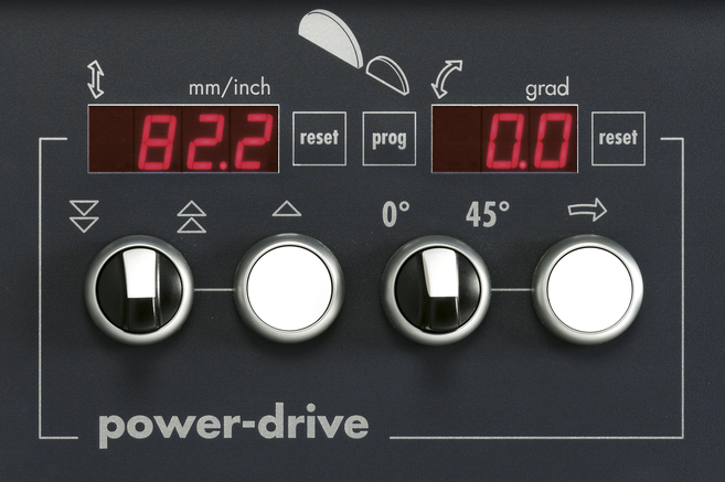 Точно с такой же точностью до десятой доли миллиметра вы можете настраивать высоту и угол наклона пильного диска. Для точной настройки в вашем распоряжении имеются специальная кнопка и наглядные светодиодные индикаторы, на которых отображаются текущие фактические значения.