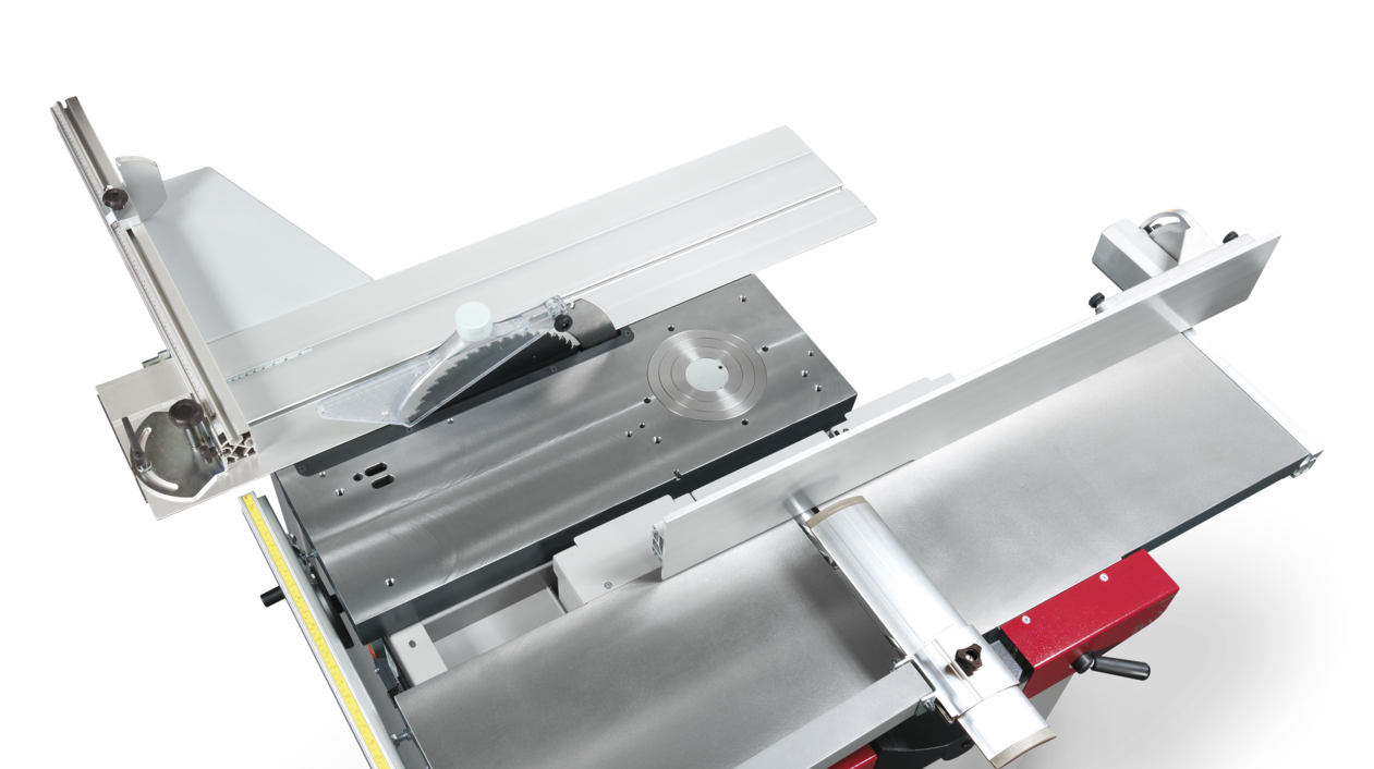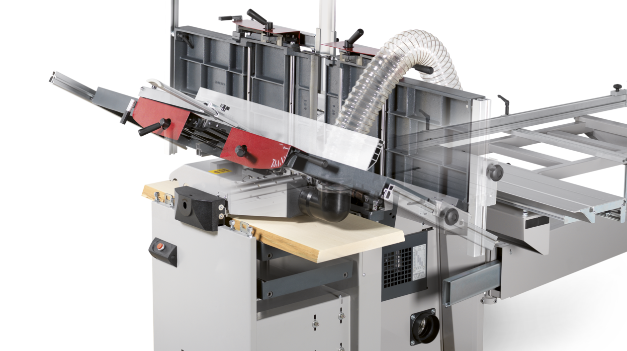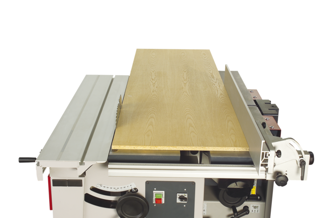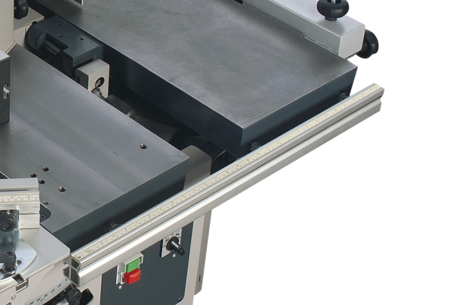ПАРАЛЛЕЛЬНЫЙ УПОР НА ФОРМАТНО-ПОДВИЖНОМ СТОЛЕ Ширина реза на форматно-подвижном столе может настраиваться в любое положение в диапазоне от 0 до 600 мм. Встроенная в направляющую рейку шкала гарантирует точную установку параллельного упора в нужное Вам положение. Алюминиевая упорная линейка может быть установлена в любое положение в направлении раскроя - это гарантирует лучшую подачу детали и высокую точность при обработке длинных заготовок. При осуществлении косого среза алюминиевая упорная линейка может легко откидываться из вертикального в горизонтальное положение. Узкий край упорной линейки позволяет осуществлять продольный распил очень тонких заготовок. |